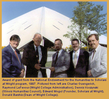 The following semester, exploring the Oedipus Cycle, Jane Upin, later Chairman of the Humanities Department at Wright, who has a Ph.D, from the University of Chicago in Philosophy, joined the group of lecturers. The program continued doing one great book each semester, always with four faculty members from different colleges or universities, some of whom had published on the book being studied. In 1997 the National Endowment for the Humanities, the Illinois Humanities Council and the Illinois General Assembly honored the program by awarding a mini-grant. Peter Kaye, a scholar of Comparative Literature, who recently won an award himself as the outstanding adjunct faculty member at Northwestern University has been the literary consultant to the Scholars at Wright program from the beginning. Michael Petersen, then a teacher at St. Patrick's High School, joined the group in 1998 as high school coordinator. He has since become a member of the Wright College faculty, in the English Department, and remains as coordinator of this program. The program has involved such scholars as Sylvie Romanowski, Chairman of the Graduate French Department at Northwestern University who lectured on Proust's Swann's Way; Marc Cogan, whose book on the structure of Dante's Inferno was published by Notre Dame Press, lectured on the Inferno; Jarrell Howard of Northeastern University, a published authority on the literature of America's South, lectured on Faulkner's Light in August; and Robert Pippin, Chairman of the Committee for Social Thought at the University of Chicago, who had just published a celebrated book on Henry James, lectured on James' Portrait of a Lady. The program has grown to include, Advanced Placement, English high school students from several Chicago and some suburban high schools as well as adult learners, including Gladys Pledger an avid reader and regular attendee who will celebrate her 100th birthday in June, 2002. In addition to the NEH grant, funding for the program has been provided by Wright College President Charles Guengerich, and Wright College Continuing Education, Cynthia Clontz. The program has also received a private donation from Carla and Alan Price to pay for the books for students who could not afford them. Hopefully, the idea of bringing students of all backgrounds together with scholars to study a great book will continue for a long time to come. |